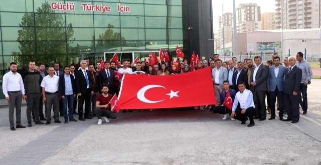 İl Müdürlüğü önünden hareket eden gençler yolculuk öncesi Barış Pınar Harekatında görev yapan Mehmetçiğe selam göndererek hatıra fotoğrafı çektirdi. – KAYSERİ