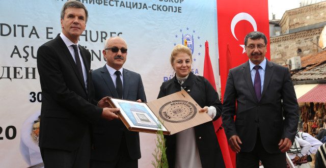 Bursa Büyükşehir Belediyesi ve Üsküp Çayır Belediyesinin himayesinde El Hilal Yardım Kuruluşu ile Ensar Yardımlaşma ve Kültür Derneğinin organizasyonunda bu yıl 12’nci kez aşure etkinliği düzenlendi. Üsküp Türk çarşısındaki Murat Paşa camii önünde düzenlenen etkinliğe Türkiye Cumhuriyeti Üsküp Büyükelçisi Tülin Erkal Kara, El Hilal Yardım Kuruluşu Başkanı Behicuddin Şehabi, Ensar Yardımlaşma ve Kültür Derneği Başkanı Süleyman Baki, Bursa Büyükşehir Belediyesi Sosyal İşler ve Eğitim Hizmetleri Şube Müdürü İbrahim Karaman ile Kültür A.Ş. Yönetim Kurulu Başkanı Rıfat Bakan da katıldı.