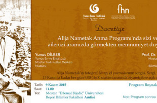 Yunus Emre Enstitüsü Mostar Türk Kültür Merkezi, Mostar „Džemal Bijedić“ Üniversitesi Beşeri Bilimler Fakültesinin desteğiyle Boşnakların ünlü yazarı, hemTürk hem Boşnak edebiyatında önemli bir yere sahip olan ve yirmi civarında eseri bulunan, 1906 yılında Mostar’da doğan ‘Alija Nametak’ı Anma Günü’ sempozyumu gerçekleştirecek. Sempozyum, „Džemal Bijedić“ Üniversitesi Beşeri Bilimler Fakültesi Amfisinde 9 Kasım 2015 Pazartesi günü saat 11:00’de. Program boşnakça olarak …