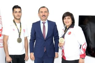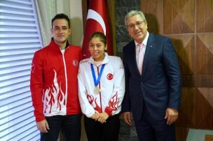 BOSNA Hersek'te düzenlenen Saraybosna Açık Yüzme Turnuvası'nda 2 altın ve 1 gümüş madalya kazanan Ege Üniversitesi (EÜ) Gençlik ve Spor Kulübü Özel Sporcular Yüzme Şubesi'nin milli sporcusu Şevval Tekin, annesi ve antrenörü ile EÜ Rektörü Prof. Dr. Necdet Budak'ı ziyaret etti.