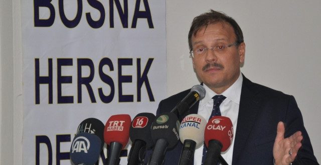 İnegöl Bosna Hersek Türkleri Kültür ve Dayanışma Derneği Başkanı Adli Kavukçu’nun ardından konuşan Başbakan Yardımcısı Hakan Çavuşoğlu, “Tam 6 yıl süre ile Bosna Hersek Türkiye parlamentolar arası başkanlık yapmış, orasını kendisine ait bir bağ kurmuş bir kardeşiniz olarak bu süreçte sizlerle beraber olmak, dayanışma ruhumuzu pekiştirmek için sizlerle bir araya gelmeyi düşündük. Dün İstanbul’da sabah, 150 ülkeden arkadaşlarımı ile bir araya geldik. Ondan bulduğum fırsatla Bayrampaşa’daki Bosna-Sancak Kültür derneğini ziyaret ettim. Onların sizlere selamını getirdim. Dün malumunuz Bosna Hersek milli günüydü. Hem milli gününe bir farkındalık oluşturmak, Boşnak kardeşlerimiz ile son günlerde yaşanan katliam nedeniyle, soykırımın tescillendiği mahkeme ile bir katile verilen cezanın bizlerin yüreğini soğutacak bir karar olduğu için sizlerle bir arada olmak. Balkanların efsane belediye başkanı olarak bildiğimiz rahmetle Şemsettin Husiç’in vefatı nedeniyle hem bir başsağlığı dilemek, hem de sizlerle burada olmak istedim. Sayın Cumhurbaşkanımızın bundan birkaç hafta evvel Sırbistan ziyaretinde Boşnak kardeşlerimizin liderimize göstermiş oldukları muhteşem kucaklamayı, ilgiyi görmüş bir arkadaşınız olarak bir yerde bu noktada size minnet duygularımı ifade etmek için buraya geldim” dedi.