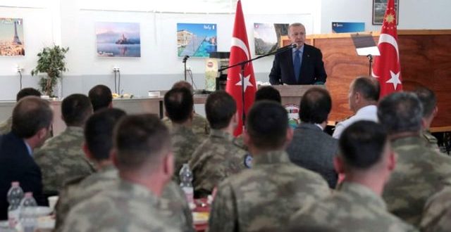 Ziyarette yaptığı konuşmaya tüm askerleri selamlayarak başlayan Erdoğan, “Sözlerimin hemen başında vatanımızın bağımsızlığı için bir gül bahçesine girercesine kara toprağın bağrına giren aziz şehitlerimizi rahmetle yad ediyorum. Kurtuluş Savaşımızı kazanarak bizlere son devletimiz Türkiye Cumhuriyeti’ni armağan eden Gazi Mustafa Kemal başta olmak üzere kahraman ordumuzun tüm mensuplarını da şükranla anıyorum” diye konuştu.