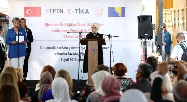 Emine Erdoğan, TİKA’nın, Bosna Hersek’te sekiz özel eğitim okulu bünyesindeki 16 atölye ile sınıfın tadilat ve donanımını sağladığını hatırlatarak, “Böylelikle çocuklarımızı birçok açıdan geliştirebilirsek engelleri de aşmış oluruz. İnsan ruhuyla, kalbiyle, vicdanıyla insandır. Herhangi bir engel insanın içindeki bu çok yönlü potansiyeli öldüremez. Yeter ki biz zihinlerimizdeki prangaları çözelim, engelleri kaldıralım” değerlendirmesinde bulundu.