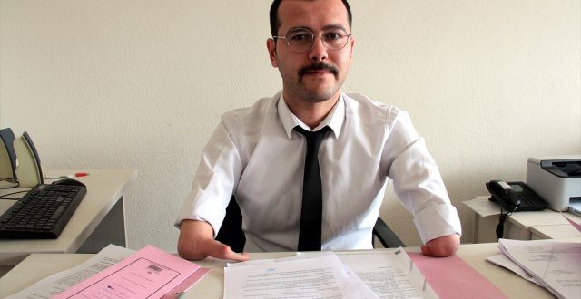 RAMAZAN KAYA – Doğuştan iki kolunun dirsekten aşağısı bulunmamasına rağmen yılmadan çalışarak avukatlık hayalini gerçekleştiren 28 yaşındaki Mehmet Metin Budak, yaşantısıyla engellilere örnek oluyor.