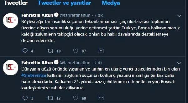 Cumhurbaşkanlığı İletişim Başkanı Fahrettin Altun, ‘Srebrenitsa katliamı’nın 24’üncü yıl dönümü nedeniyle Twitter hesabından açıklama yaptı. Altun, şunları kaydetti: