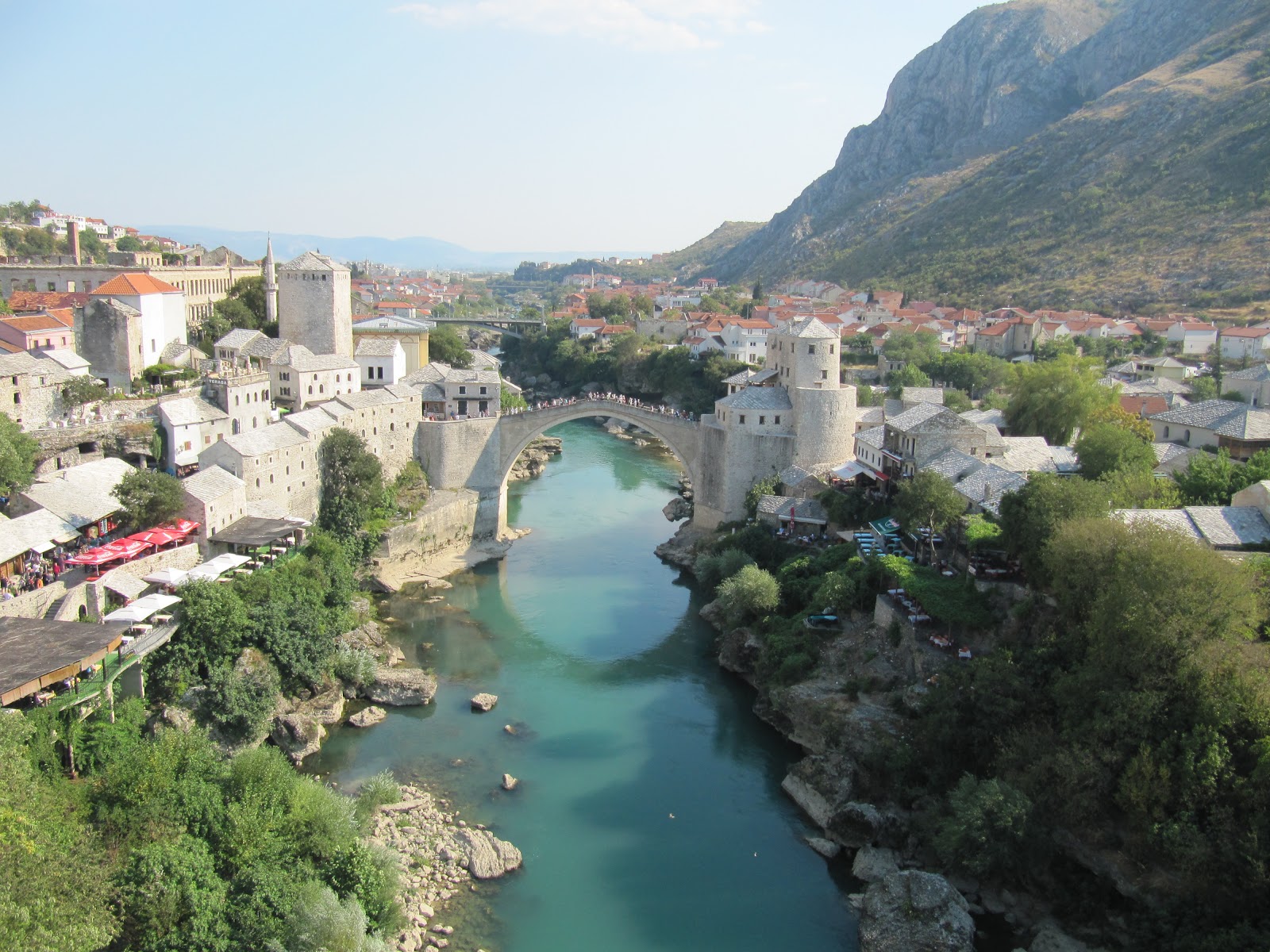 Mostar sanki sehir degil de kucuk bir kasaba gibi. Osmanli’dan kalma bircok eser yine burada da karsimiza cikiyor; dolayisiyla yine memleketimdeymis hissine kapiliyorum 🙂 Gezilebilecek yerler arasinda camiler, Turk ve Osmanli evleri (muze olarak duzenlenmis) gibi yerler var. İsmini hatirlayamadigim caminin birinin minaresine cikip guzelim Mostar koprusunu tepeden izleyebilirsiniz. Cikarken cok korksam da minareye cikmayi basardim, gercekten manzara gorulmeye degerdi. Mostar ve koprusu baska hicbir yerden bu kadar guzel izlenemezdi herhalde.