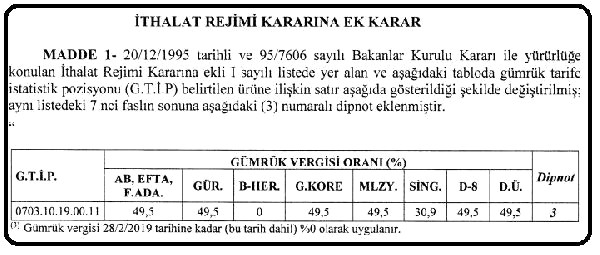 Konuya ilişkin Cumhurbaşkanı kararı Resmi Gazete’nin bugünkü sayısında yayımlandı. Kuru soğan ithalatında gümrük vergisi; Bosna Hersek için sıfır, Singapur için yüzde 30.9, diğer ülkeler için yüzde 49.5 olarak uygulanıyordu. (Tablo) – İstanbul