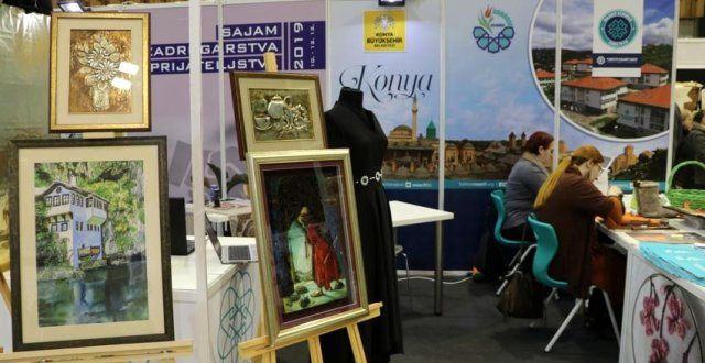 Konya Büyükşehir Belediyesi Meslek Edindirme Kurslarının (KOMEK) Saraybosna Şubesi’nde üretilen ahşap boyamadan filografiye, kağıt rölyeften giyim ve mefruşata kadar pek çok ürün Saraybosna’da açılan “Üretim, Tanıtım ve Dağıtım Fuarı”nda tanıtıldı.