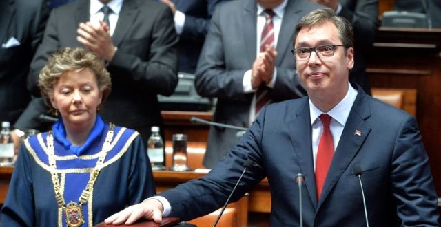 Sırbistan’da cumhurbaşkanlığı seçimlerini kazanan Aleksandar Vuçiç, parlamentoda düzenlenen törende yemin etti. Sırbistan’da cumhurbaşkanlığı seçimlerinden galip çıkan Aleksandar Vuçiç, parlamentoda düzenlenen törende yemin etti. Vuçiç, yemin töreninde yaptığı konuşmasında, Sırbistan’ın ciddi ve güçlü bir ülke olduğunu vurgulayarak, bölgede Bosna Hersek, Arnavutluk, Karadağ ve Makedonya’nın yanı sıra Macaristan, Romanya ve Bulgaristan’la işbirliğini güçlendirmek istediklerini söyledi.