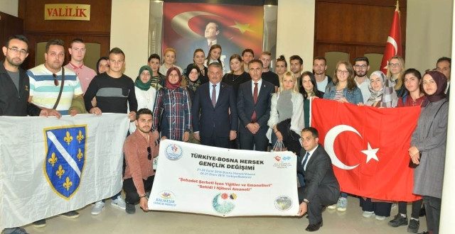 Bosna Hersek’ten Balıkesir’e gelen öğrenci heyeti, Balıkesir’de Vali Ersin Yazıcı’yı makamında ziyaret etti. Balıkesir Gençlik Merkezi ile Bosna Hersek’te faaliyetlerini sürdüren Association “Youth Volunteers” derneği arasında planlanan “Şehadet Şerbetini İçen Yiğitler ve Emanetleri” temalı gençlik değişimi programı, 21-28 Eylül tarihleri arasında Bosna Hersek’in Visako şehrinde, 24-31 Ekim tarihlerinde ise Balıkesir’de gerçekleşti.