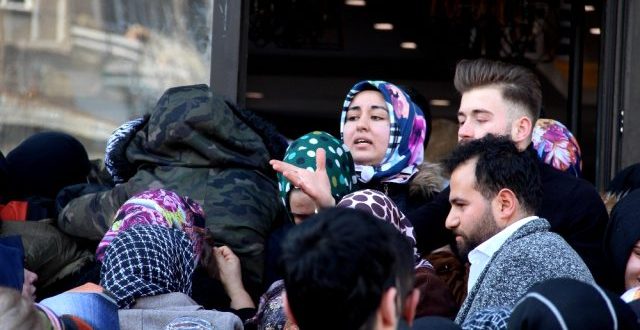 Erzurum’un Yakutiye ilçesi Saray Bosna Mahallesi’nde yeni açılan bir mağazada indirim olduğunu duyan yüzlerce kadın mağazaya akın etti. Mağaza önünden oluşan uzun kuyruklar sonrası içerideki indirime ulaşmak isteyen kadınlar adeta birbirlerini ezdi geçti. Polis ekiplerince araç trafiği bir süreliğine kapatılırken kalabalıkta bir kadın fenalık geçirerek bayıldı.