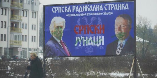 Soykırımın da aralarında bulunduğu 11 ayrı suçtan yargılanan, hakkındaki kararın bugün açıklanacağı Bosnalı Sırpların eski lideri Radovan Karadzic’e destek amacıyla Sırp nüfusun yoğun olduğu Doğu Saraybosna’da, üzerinde “Sırp kahramanlar” yazılı Karadzic ve Vojislav Seselj fotoğrafları reklam panolarına asıldı.